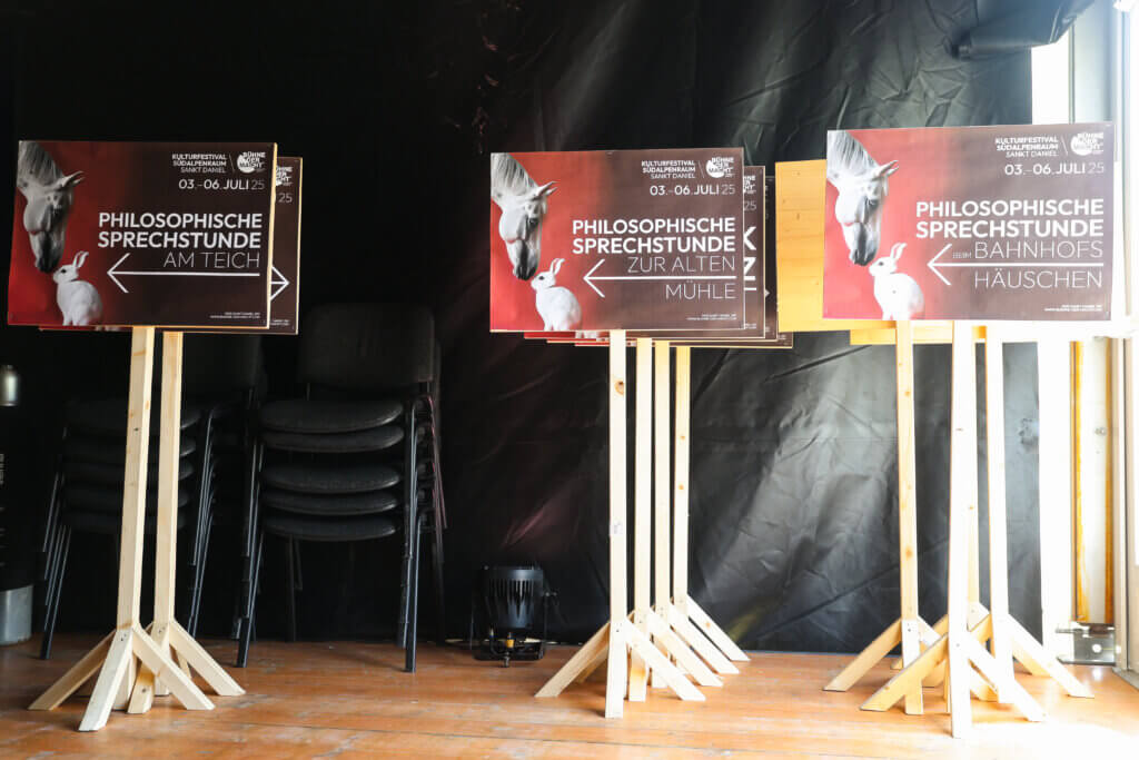 Unsere Festival-Philosoph:innen Laura Achenbach, Bettina Bussmann und Gerd Forcher sind von Freitag 4.7. bis Sonntag 6.7. an diesen besonderen Orten in Sankt Daniel für Sie kostenlos zu sprechen: